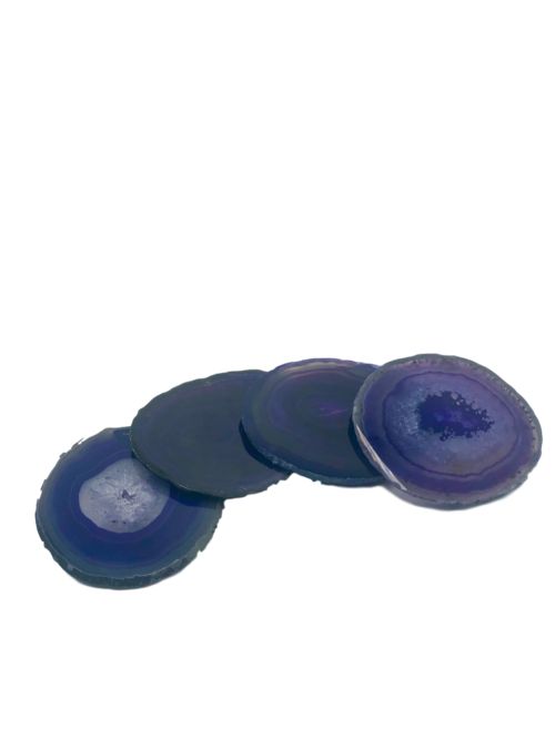 Unique agate coasters are a perfect touch. These natural coasters come in two sizes, with four coasters in each set. Beautiful and useful, enjoy the shimmering patterns found in each specimen. Choose your favorite color agate with a natural trim.