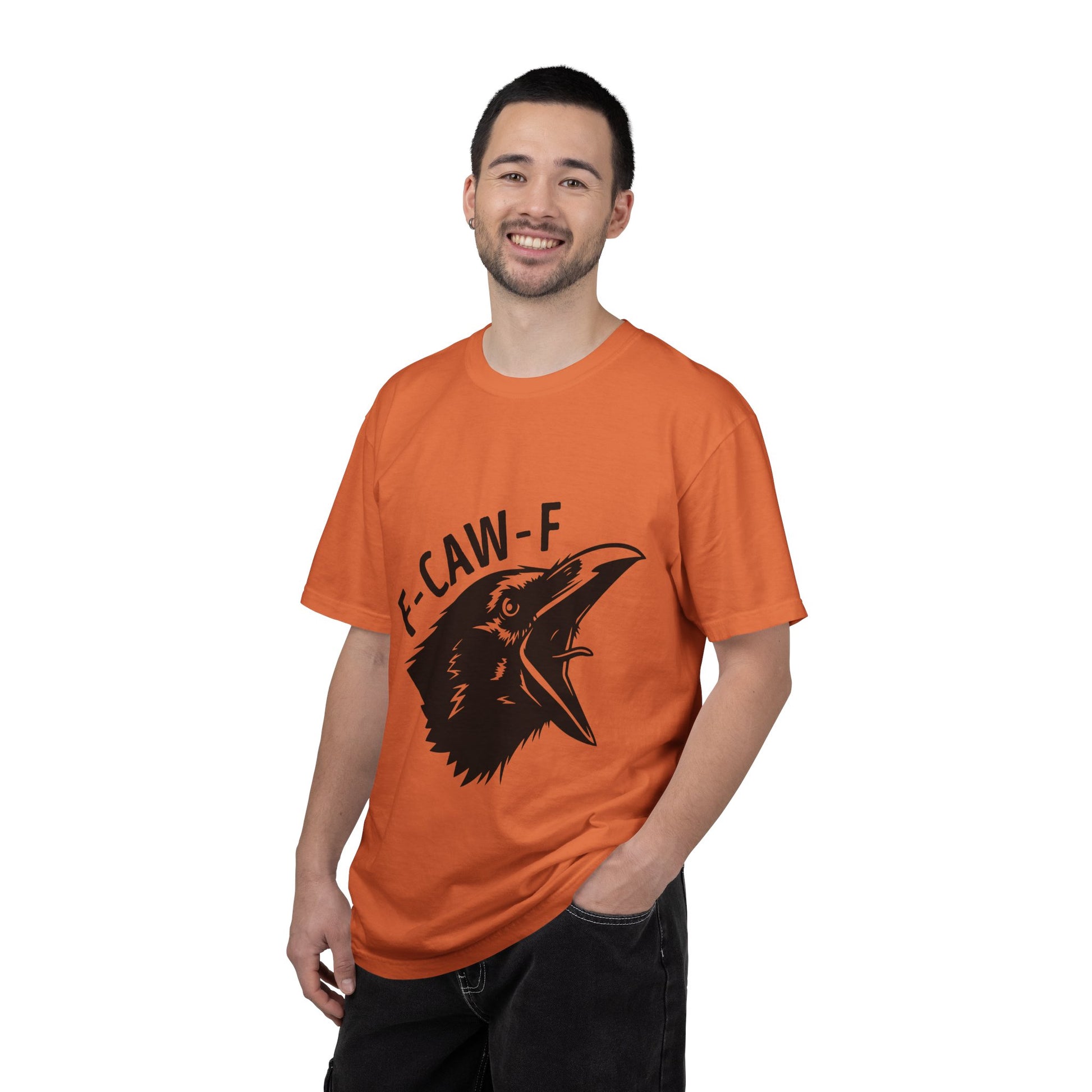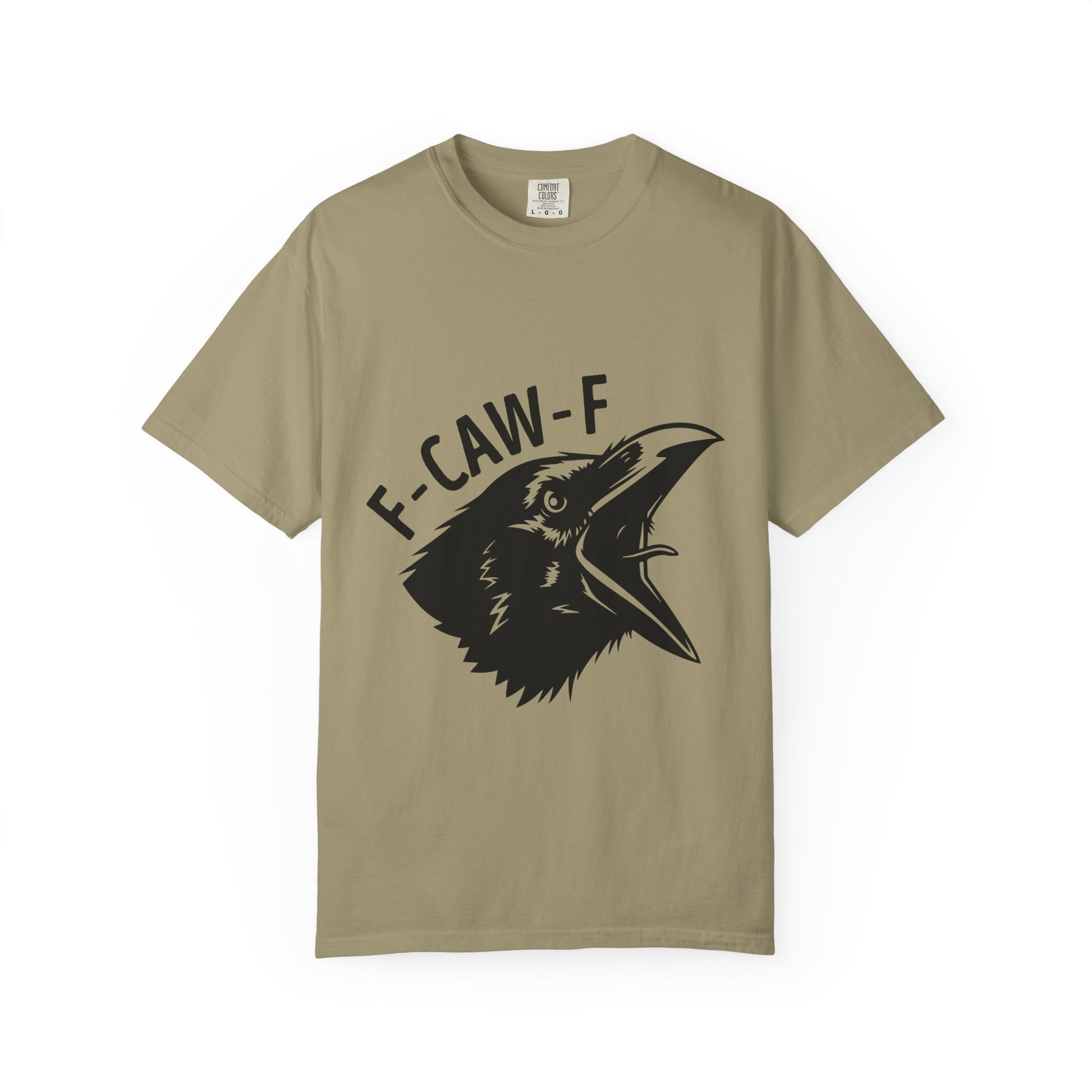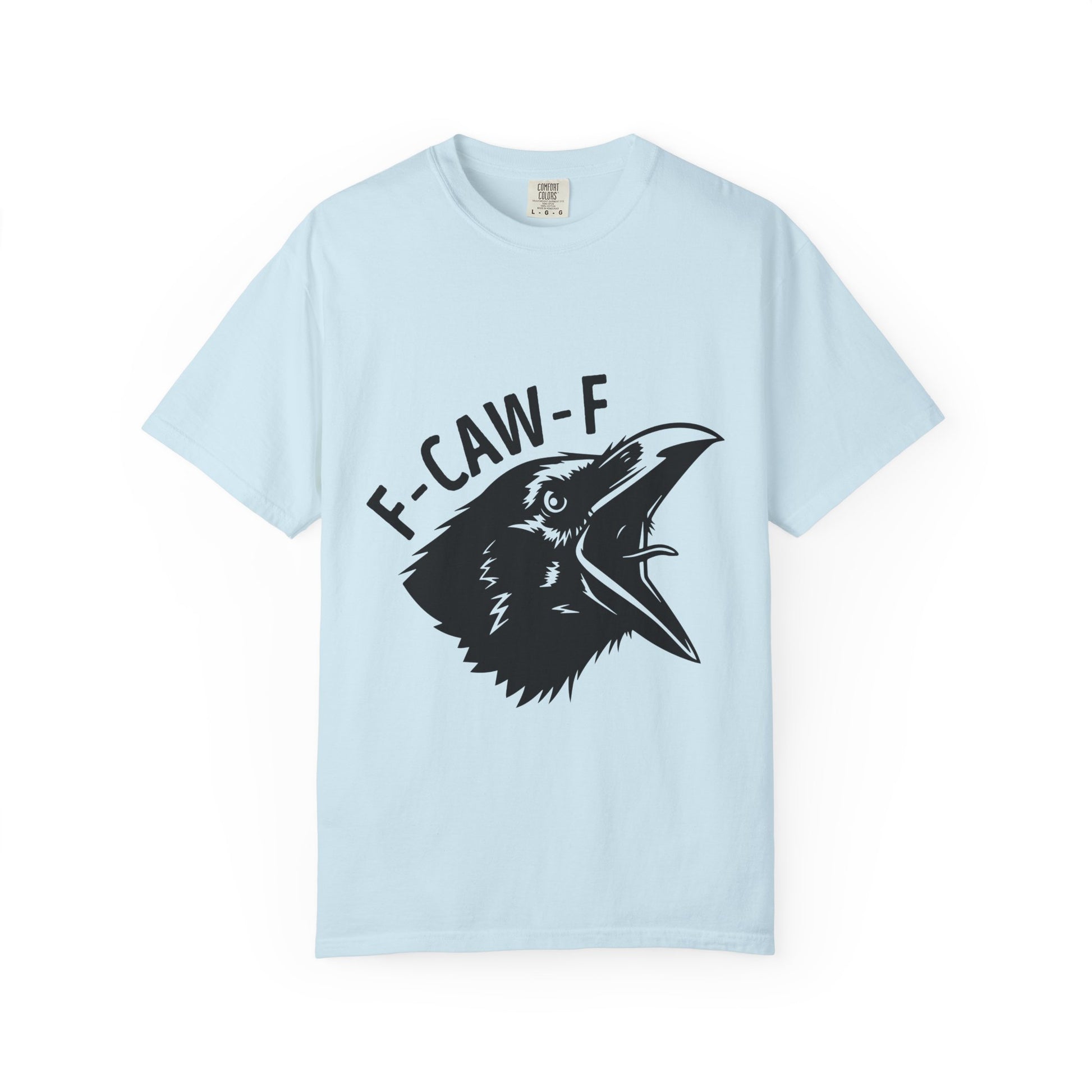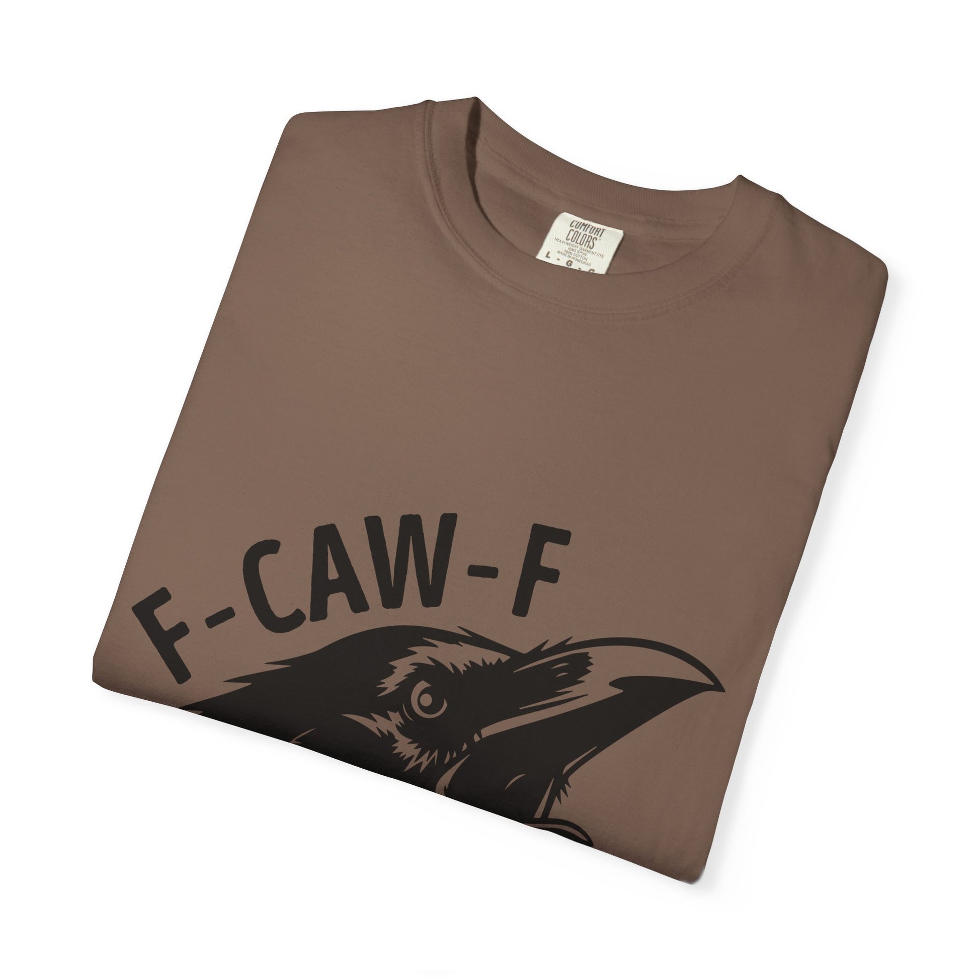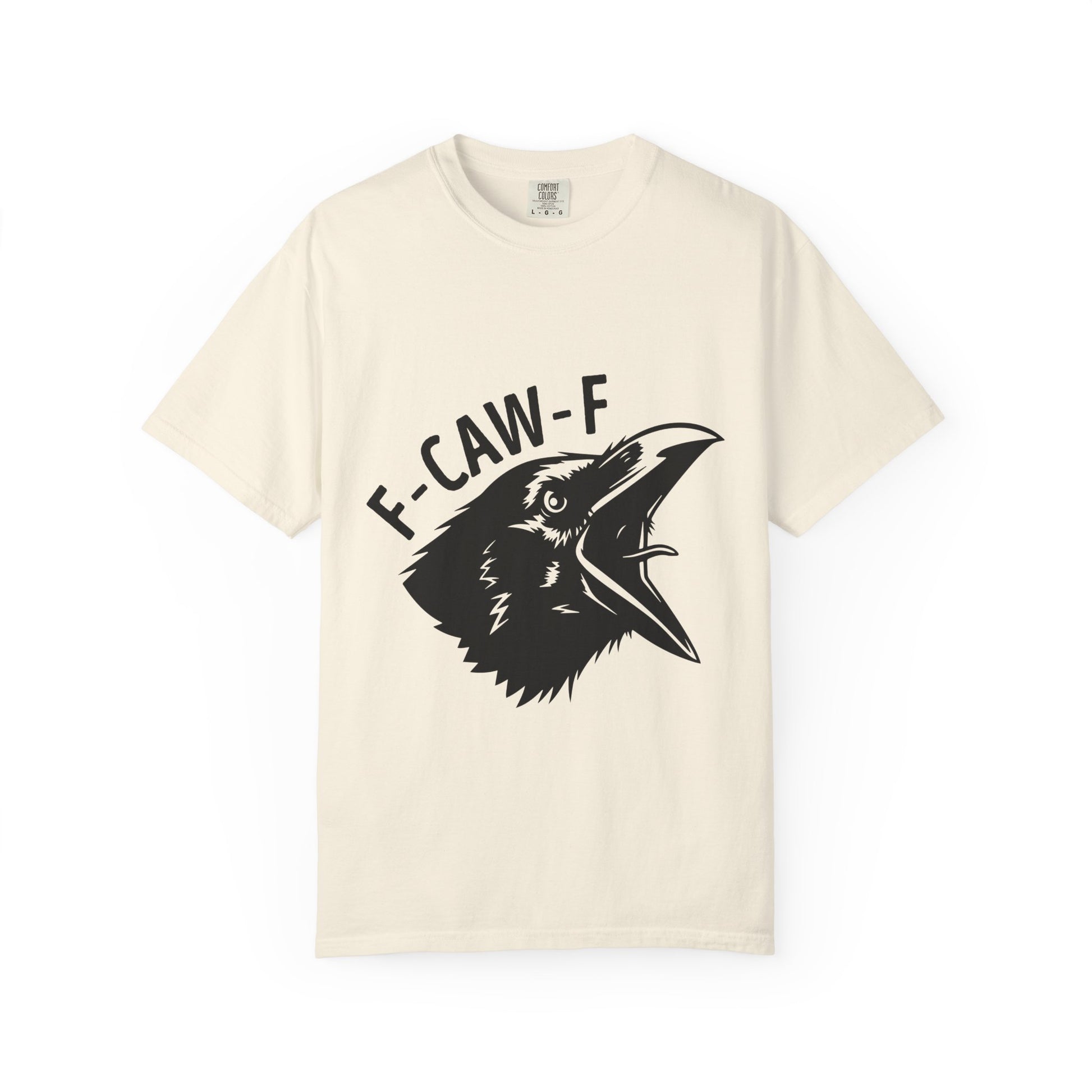 A soft garment-dyed tee with a bold raven graphic and cheeky lettering that reads “F-CAW-F.” The relaxed fit and medium-weight 100% ring-spun cotton drape comfortably for everyday wear. The print’s stark black-on-white contrast gives this shirt a slightly punk, irreverent edge — great for people who like their humor sharp and their style uncomplicated. Wear it while wandering city streets, grabbing coffee with friends, or at low-key shows; it carries a sly sense of mischief without trying too hard.